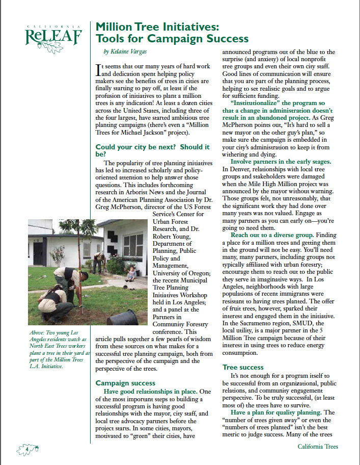 Published in: California Trees, newsletter of California ReLeaf Date: Winter 2010 Summary: At least a dozen cities across the United States have started ambitious tree planting projects. But what does it take to be successful? Million Tree Initiatives: Tools for Campaign Success Million Tree Initiatives: Tools for Campaign Success Tagged on: Million Trees Newsletter Tech transfer